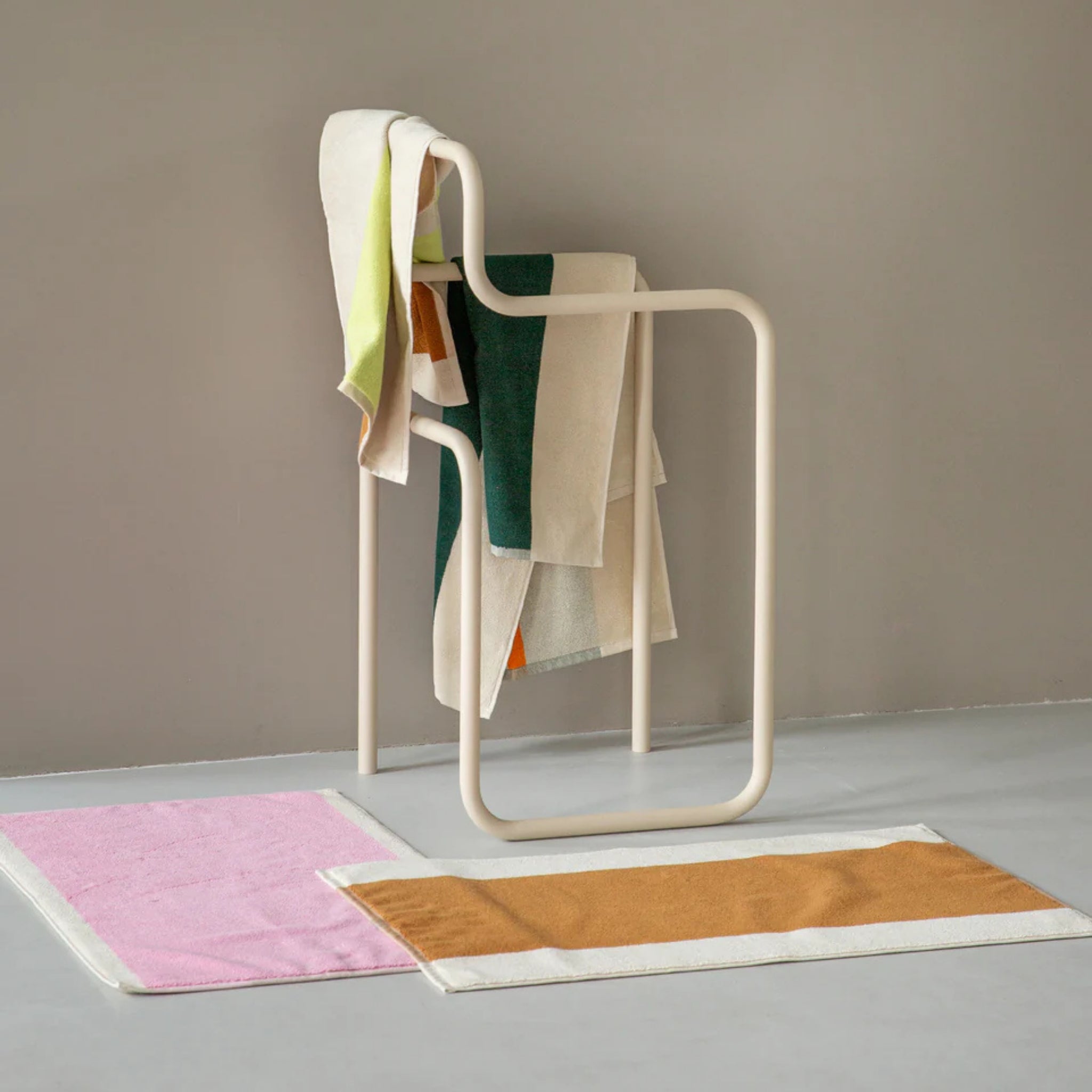 Deze badmat (50x80 cm) van Suite 702 is het resultaat van de samenwerking met Karel Martens. De toffee en turquoise zijdes zorgen samen met de contrasterende voor- en achterkant voor een frisse en speelse uitstraling.