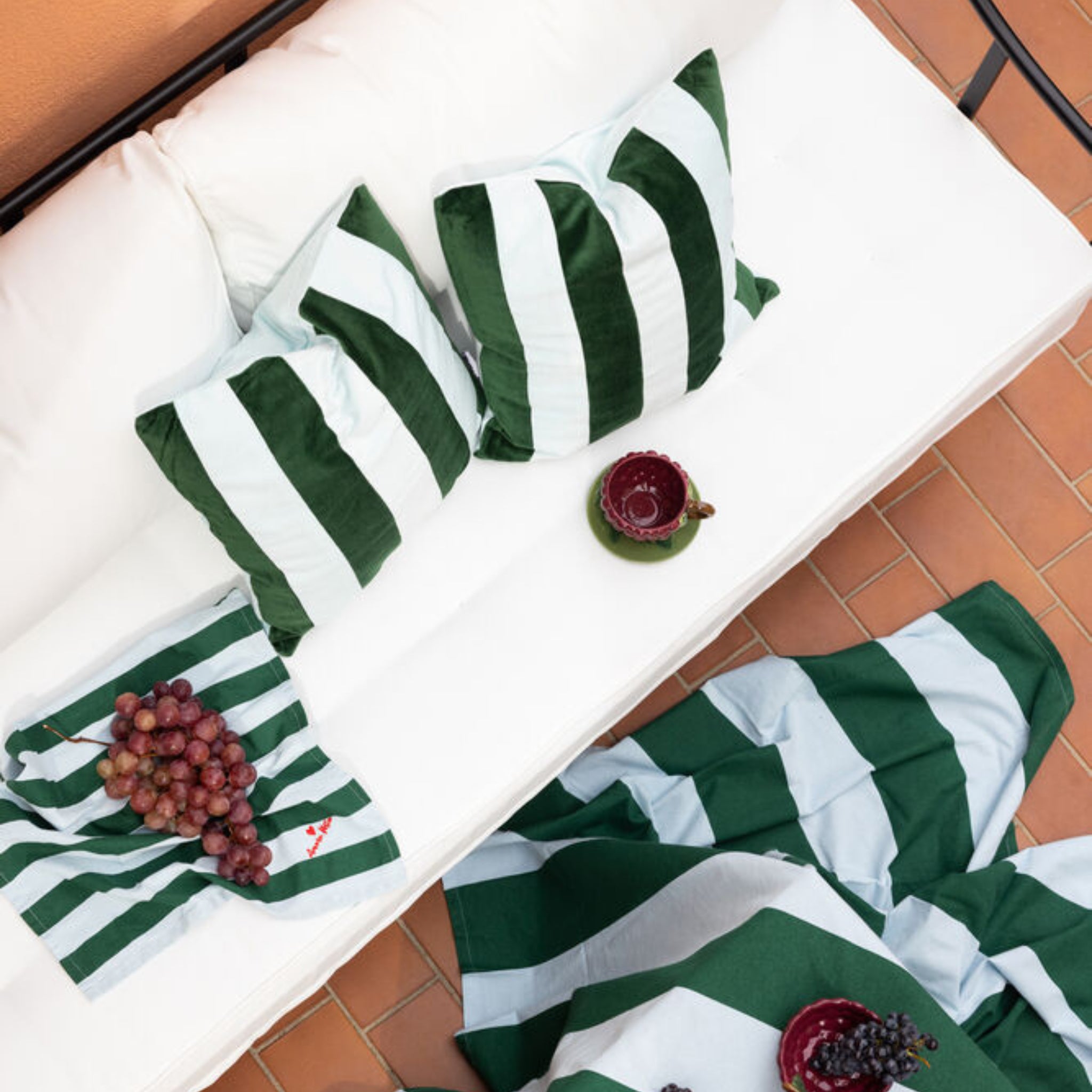 Het Byon Pathi kussen is het gezelligste kussen met modieuze strepen in koel lichtblauw en diep donkergroen. Gemaakt van zacht katoenvelours, waardoor je meteen een mix van attitude en luxe op je sofa krijgt. Een opkomende favoriet die moeilijk te missen is.