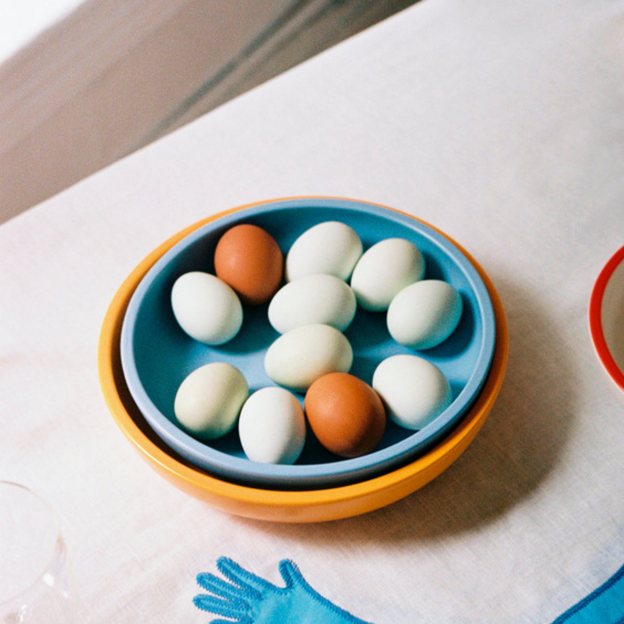 De Sobremesa-collectie omvat verschillende maten en uitvoeringen, van effen kleuren tot varianten met een contrasterende rand. De schalen kunnen afzonderlijk worden gebruikt of gecombineerd om een persoonlijke en kleurrijke tafelschikking te creëren.