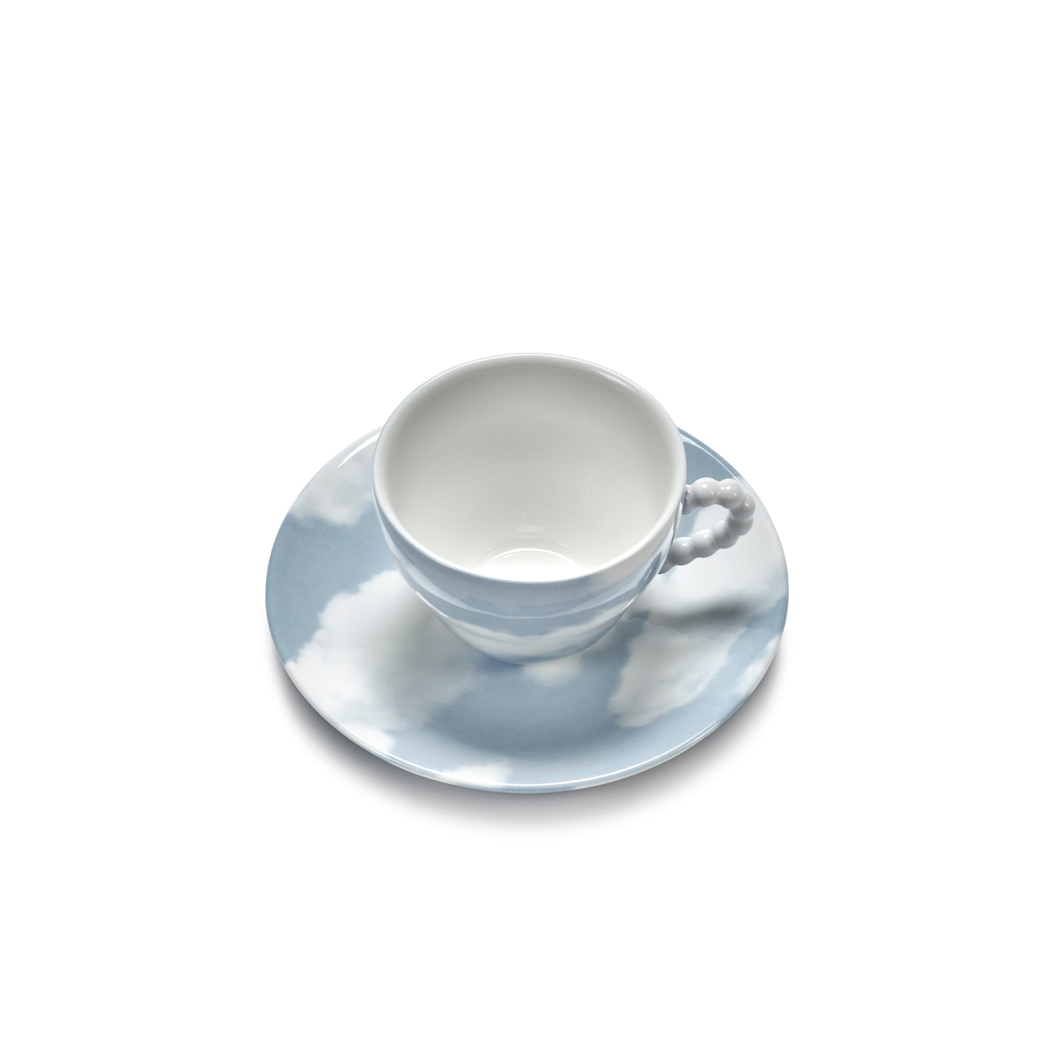 De koffiekop met schotel Fête Des Bêtes van Serax in lichtblauw is ontworpen door Antwerpse juweelontwerpers Wouters & Hendrix en brengt een speelse, artistieke toets aan elk koffiemoment.